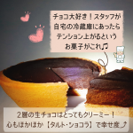2025年3月8日 / 最終更新日時 : 2025年3月8日 chezmomu.com 最新のお知らせ バスクチーズケーキ♫店頭に並びました(^^)チョコバスク!がなんと・・継続販売決定!3月のバスクチーズは2種類♡ ☆家族やパートナーとのおやつ時間に(^^) 4号サイズ(直径12cm)なので、2~3人でシェアするのにピッタリ♫ 焼加減で食感が変わるのも、このスイーツならではの楽しみのひとつです(^^)・常温→とろっと濃厚・冷蔵→しっ […]